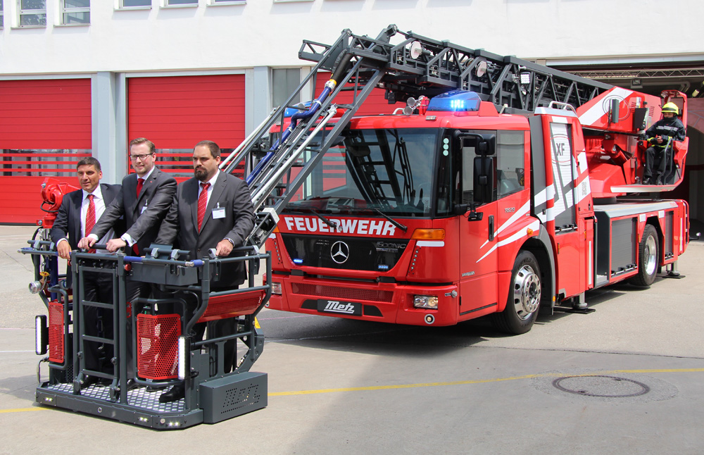 Am 12.06.2013 hatte die Firma Metz / Rosenbauer Group nach Karlsruhe eingeladen. Neben dem Geschäftsführer der Metz Aerials Michael Kristeller begrüßte auch der Rosenbauer CEO Dr. Dieter Siegel die Anwesenden. Im Vordergrund der Präsentation standen die neuen Drehleitertyen „XS“ und „XF“. Nach einer Führung durch das Werk und die Produktion ging es auf dem Werksgelände zur praktischen Vorführung der beiden neuen Drehleitertypen. Als Exponate wurden eine L32A-XS und eine L32A-XS-F vorgestellt. „XS-F“ bedeutet, die Drehleiter hatte neben dem XS Leitersatz auch eine XF Aufbauvariante auf einem Econic Fahrgestellt. XS steht für „extra small“, während XF für „extra flat“ steht, die Kombination nennt sich dann XS-F.